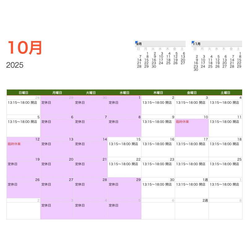 10月の営業日